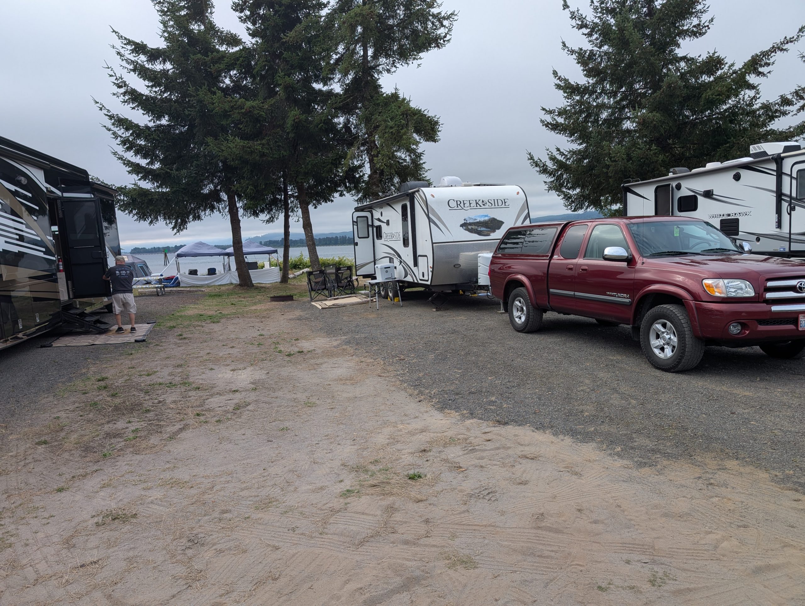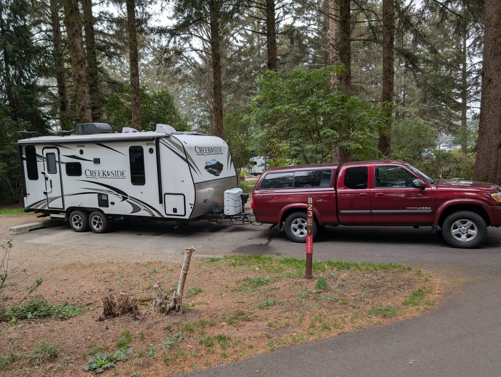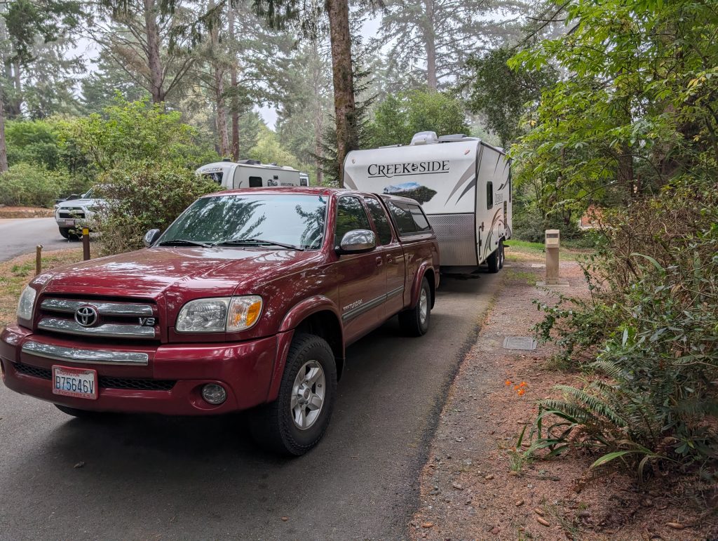 Andy had received a text on his phone while we were driving towards Tofino that provided us with our campsite number and informed us that we were now officially “checked in” and didn’t have to stop and register at the camp office. Great! So, to our site we proceeded. Well, the sites are so close together with very little place to park your pulling vehicle, that we had to ask the kind gentleman across the road from us to move his truck so that Andy could back into our site. He was most accommodating and even helped me guide Andy as he backed our trailer into a site designed for a Volkswagen Beetle. But we made it work.
