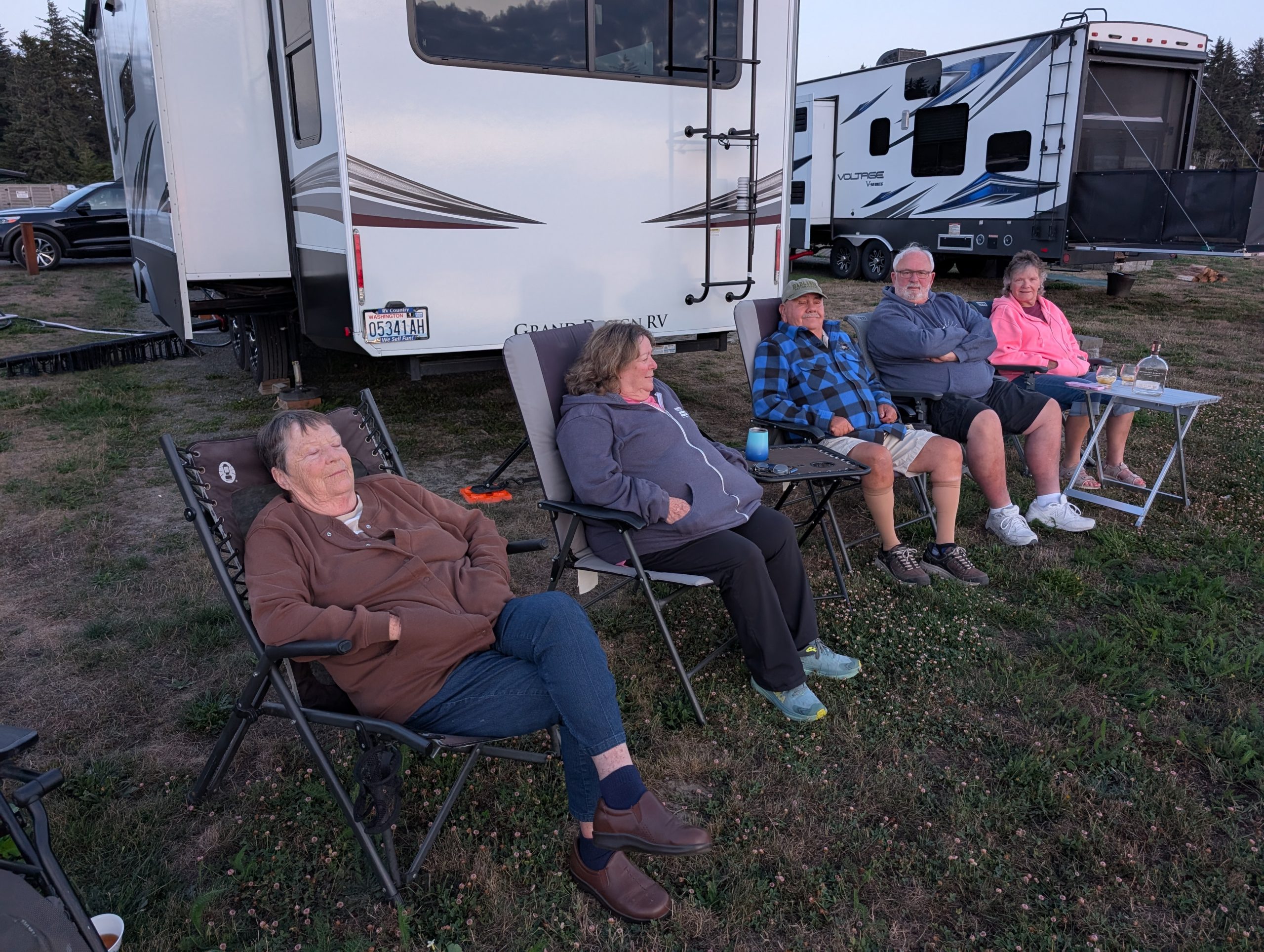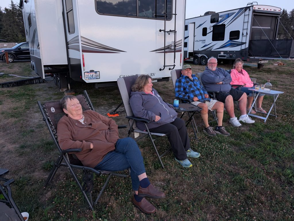 Then off to our own rigs to honker down for the night. Rain was predicted, so all chairs and little tables ran for cover. Assisted of course by their respective owners.