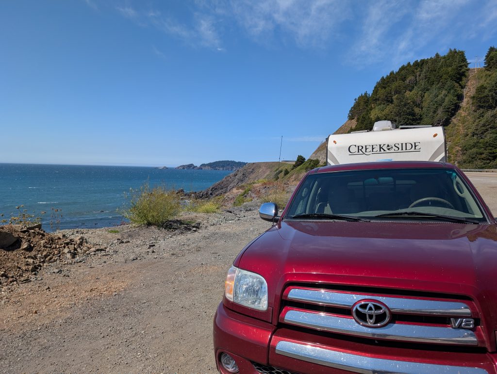 After a tasty (if I do say so myself) Patti MacMuffin (toasted English muffin, meat of choice (today’s meat – link sausage), sliced sharp cheddar cheese, and a fried egg, we leisurely broke camp because today was once again a short travel day on a road we knew very well. Our destination being Peach Beach, one of our favorite places to park our trailer.