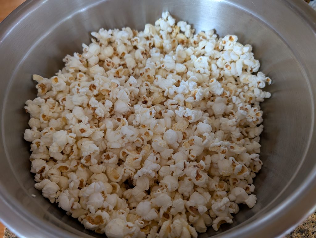 Remove from heat and carefully pour the popped corn into a large bowl.